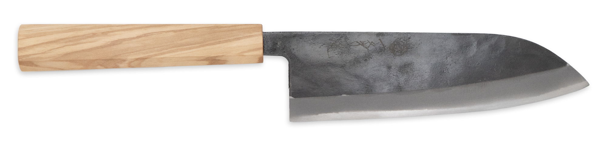 Designed for fans of rustic, black-finished blades, this Blue Steel #2 knife line is paired with an olive wood handle showcasing a beautiful and natural grain, familiar to fans of our best-selling Jin series.