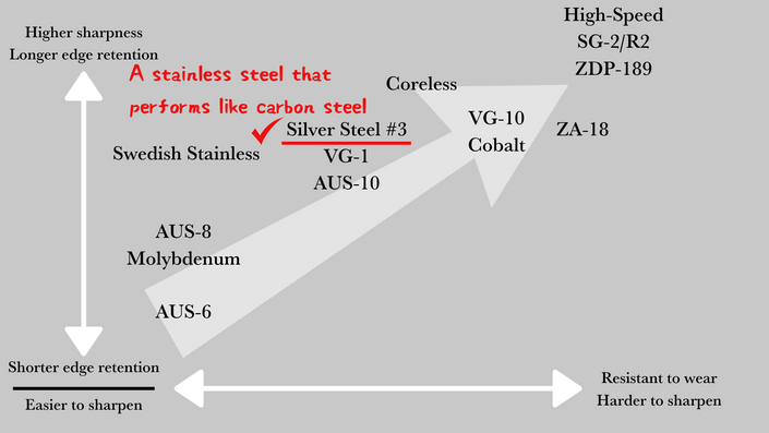 Silver Steel #3 is a traditional stainless steel, used for many years in the Japanese kitchen knife world and trusted by chefs who need premium sharpness. Hitachi Metals, a manufacturer of carbon steels like White Steel and Blue Steel, developed Silver Steel #3 as a rust-resistant stainless steel, with increased carbon levels to allow it to perform more like a traditional carbon steel knife. It has brilliant edge retention, and is suitable for people who need to use a knife for longer sessions and still want amazing cutting power, but are concerned about rust. This is popular with professionals, home users and newcomers alike.