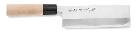 A Nakiri knife is a double edged , rectangular shaped knife mainly used in Japanese households for chopping vegetables. The shape of the blade allows for your cut to go straight down to the cutting board, eliminating the rocking motion of other knives.