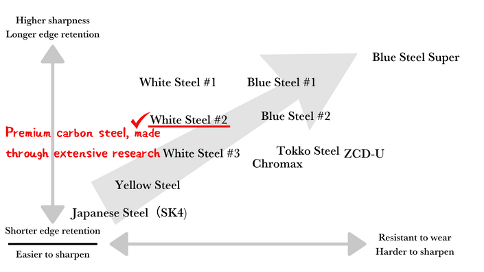 Par rapport à l'acier blanc n° 1, l'acier blanc n° 2 est plus doux, il est donc légèrement plus durable et moins susceptible de s'écailler.