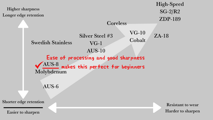 8A, 몰리브덴 강철 및 기타 이름으로도 알려진 AUS-8은 녹에 강하고 깎기 쉽습니다. 식칼 업계에 처음 입문하는 분들에게 추천합니다.