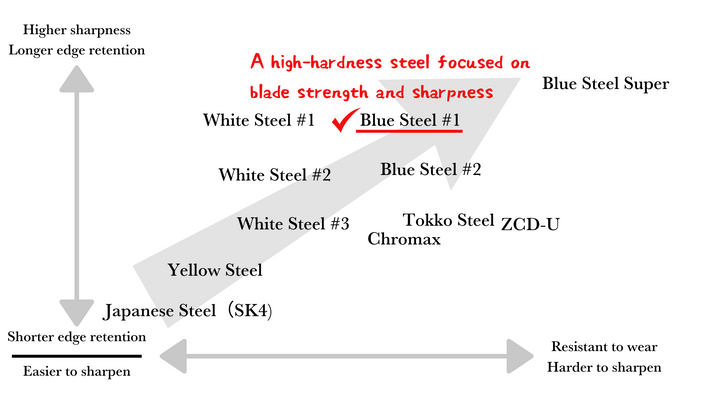 Blue Steel #1 is a higher carbon version of Blue Steel #2, and thus a harder steel. Both Blue Steels are made by adding trace amounts of tungsten and alloy carbides (both for hardness), and chromium (for toughness and rust resistance) to White Steel, creating a very tightly bonded alloy steel. The higher carbon levels in Blue Steel #1 increase hardness levels even further, leading to better sharpness and edge retention. We recommend Blue Steel #1 to those who want a premium cutting experience, but also need a knife that stays sharp for a long time. This is truly a steel for professionals.