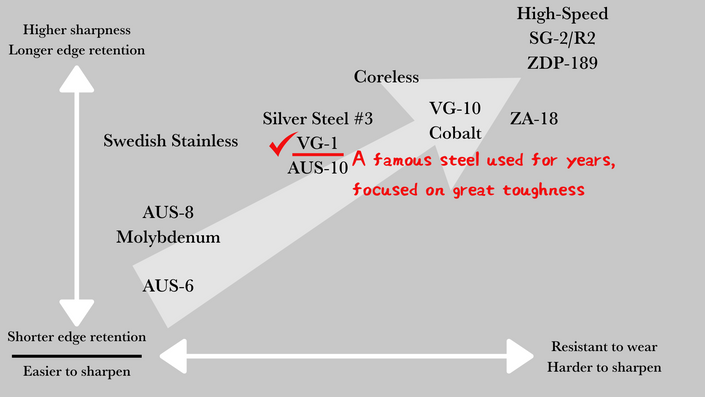 VG-1 作為一種可靠的不鏽鋼,我們已使用它製作刀具數十年。它的主要特點是高硬度,這也意味著它有更長的刀刃保持力。與其他不銹鋼相比,製作精良的 VG-1 刀會有極佳的銳利度,因為原料中的雜質含量極少。雖然高硬度會讓磨刀變得有點困難,但也讓刀具可以長時間保持良好的切削效果。我們推薦這種鋼材給那些切割時間較長,而且不想在這些過程中磨銳的人。
